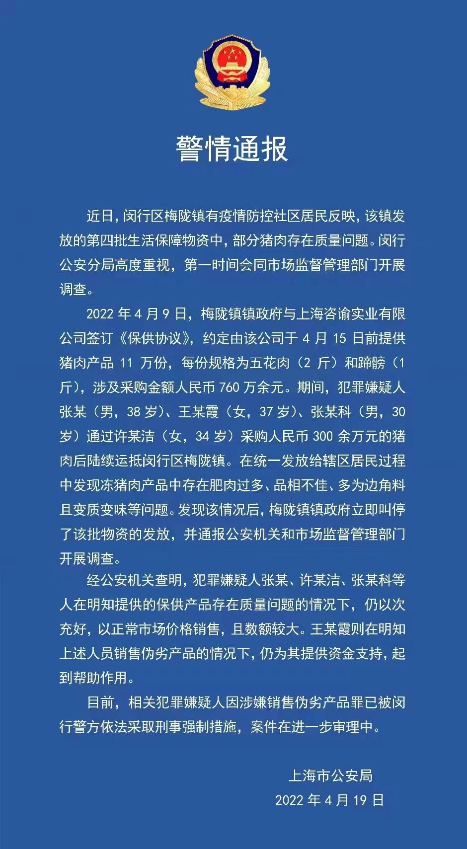 警方通報:2022年4月9日,梅隴鎮(zhèn)鎮(zhèn)政府與上海咨諭實業(yè)有限公司簽訂《保供協(xié)議》,約定由該公司于4月15日前提供豬肉產(chǎn)品11萬份,每份規(guī)格為五花肉(2斤)和蹄髈(1斤),涉及采購金額人民幣760萬余元。其間,犯罪嫌疑人張某(男,38歲)、王某霞(女,37歲)、張某科(男,30歲)通過許某潔(女,34歲)采購人民幣300余萬元的豬肉后陸續(xù)運抵閔行區(qū)梅隴鎮(zhèn)。在統(tǒng)一發(fā)放給轄區(qū)居民過程中發(fā)現(xiàn)凍豬肉產(chǎn)品中存在肥肉過多、品相不佳、多為邊角料且變質(zhì)變味等問題。發(fā)現(xiàn)該情況后,梅隴鎮(zhèn)鎮(zhèn)政府立即叫停了該批物資的發(fā)放,并通報公安機關(guān)和市場監(jiān)督管理部門開展調(diào)查。