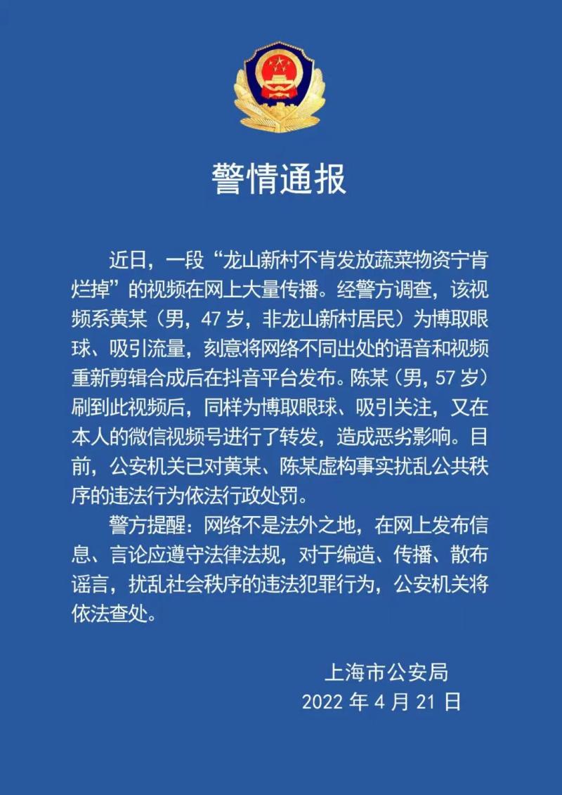 近日,一段“龍山新村不肯發(fā)放蔬菜物資寧肯爛掉”的視頻在網(wǎng)上大量傳播。經(jīng)警方調(diào)查,該視頻系黃某(男,47歲,非龍山新村居民)為博取眼球、吸引流量,刻意將網(wǎng)絡(luò)不同出處的語(yǔ)音和視頻重新剪輯合成后在抖音平臺(tái)發(fā)布。陳某(男,57歲)刷到此視頻后,同樣為博取眼球、吸引關(guān)注,又在本人的微信視頻號(hào)進(jìn)行了轉(zhuǎn)發(fā),造成惡劣影響。目前,公安機(jī)關(guān)已對(duì)黃某、陳某虛構(gòu)事實(shí)擾亂公共秩序的違法行為依法行政處罰。