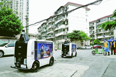 4月25日,無人快遞車行駛在上海市楊浦區(qū)長海路街道浣紗小區(qū)內(nèi)。為幫助解決該小區(qū)物資配送難題,上海理工大學(xué)菜鳥驛站安排了兩臺(tái)無人快遞車進(jìn)駐,將物資配送到居民家門口。新華社記者 張建松攝
