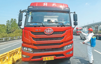 4月21日,郭輝駕駛貨車返回南京后,防疫工作人員對貨車進行消毒。