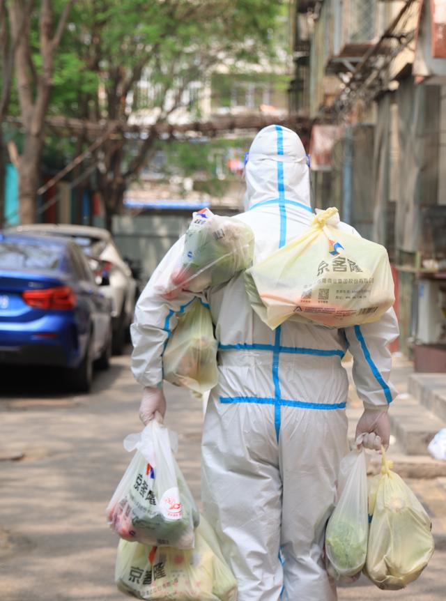 身穿防護(hù)服的“大白”,手里拎著、腋下夾著七八袋蔬菜,送給封控居民。他的背影被攝影師定格下來(lái),感動(dòng)了很多人。