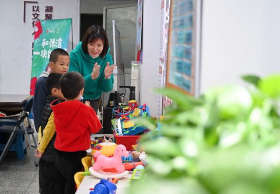 2021年12月4日,張潔(右一)在“村童媽媽聚樂部”教小朋友演唱歌曲《愛的鼓勵(lì)》。 新華社記者 林善傳 攝