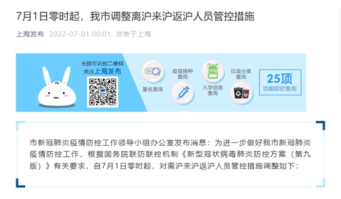 市新冠肺炎疫情防控工作領(lǐng)導(dǎo)小組辦公室發(fā)布消息:為進(jìn)一步做好我市新冠肺炎疫情防控工作,根據(jù)國務(wù)院聯(lián)防聯(lián)控機(jī)制《新型冠狀病毒肺炎防控方案(第九版)》有關(guān)要求,自7月1日零時起,對離滬來滬返滬人員管控措施調(diào)整如下: