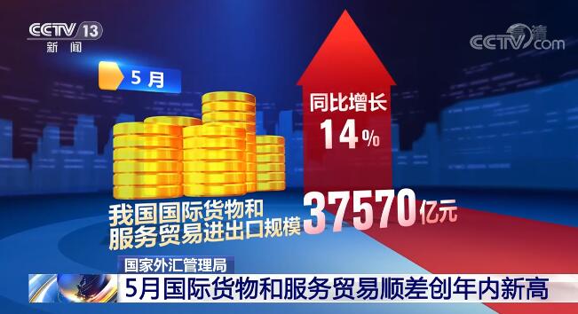 國(guó)家外匯管理局最新數(shù)據(jù)顯示,5月,我國(guó)國(guó)際貨物和服務(wù)貿(mào)易進(jìn)出口規(guī)模37570億元,同比增長(zhǎng)14%;國(guó)際貨物和服務(wù)貿(mào)易順差3514億元,創(chuàng)年內(nèi)新高。具體來(lái)看,貨物貿(mào)易順差4022億元,服務(wù)貿(mào)易逆差508億元。