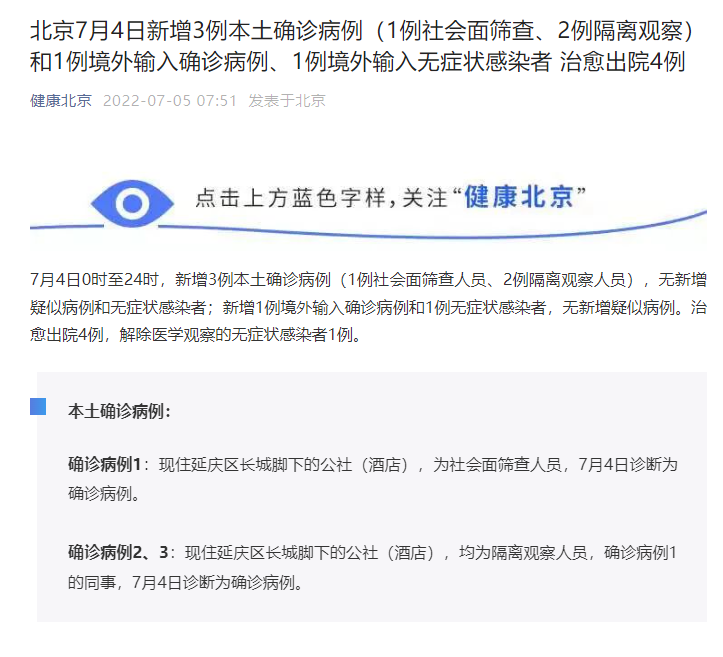 確診病例2、3:現(xiàn)住延慶區(qū)長(zhǎng)城腳下的公社(酒店),均為隔離觀察人員,確診病例1的同事,7月4日診斷為確診病例。