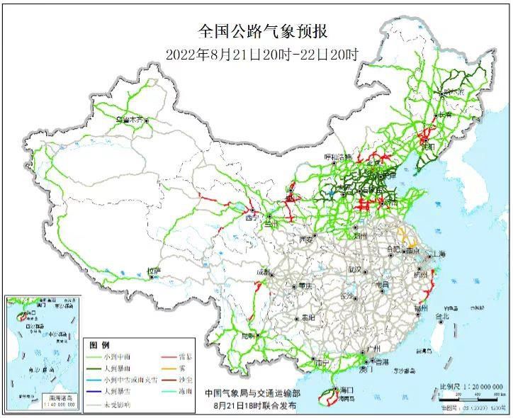 8月21日20時至22日20時,陜西北部、山西中北部、河北中部、北京南部、天津、山東西北部及黑龍江中部和東北部、云南西南部、海南島西北部等地的部分地區(qū)有大到暴雨,其中,陜西東北部、山西北部、河北中部等地局地有大暴雨。河北北部和南部、遼寧西北部、吉林中部、山東西北部、浙江沿海、福建東北部、海南島大部、四川中南部、寧夏大部、青海中東部等地局地有雷暴。另外,江蘇中北部、云南中部等地局地有霧。