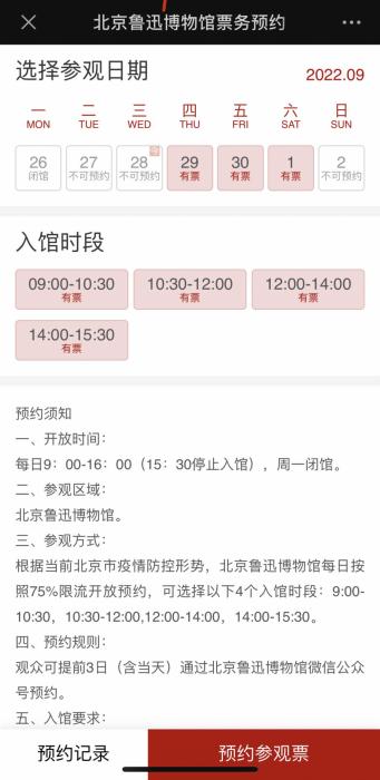 其實(shí),市民不一定非得在假期選擇去熱門(mén)場(chǎng)館,一些家門(mén)口的博物館同樣也能滿足大家的文化需求,且目前票量充足。史家胡同博物館10月1日、2日、4日至7日正常開(kāi)放,10月3日(周一)例行閉館,目前預(yù)約名額充足;北京魯迅博物館可提前3天預(yù)約(含當(dāng)天),目前可預(yù)約的名額也很充足。