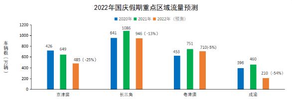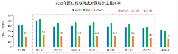 (四)成渝地區(qū)。目前,四川省疫情防控形勢(shì)總體可控,平穩(wěn)向好,尤其是成都市已取得階段性成果,但提倡就地過節(jié)以及較為嚴(yán)格的跨省跨市疫情管控措施將較大影響公眾出行意愿,出行需求相比中秋雖有所反彈,總體仍相對(duì)較低。預(yù)計(jì)成渝區(qū)域假期高速公路日均流量約為210萬輛,同比2021年(460萬輛)下降54%左右。其中,日均客車流量為173萬輛左右,日均貨車流量為37萬輛左右。國慶假期短途短期出游特征明顯,預(yù)計(jì)公眾跨省長(zhǎng)途旅游、探親等出行需求將進(jìn)一步降低;市內(nèi)出行需求將有所增長(zhǎng),以城市周邊短途短期的休閑游、親子游和健身游為主。