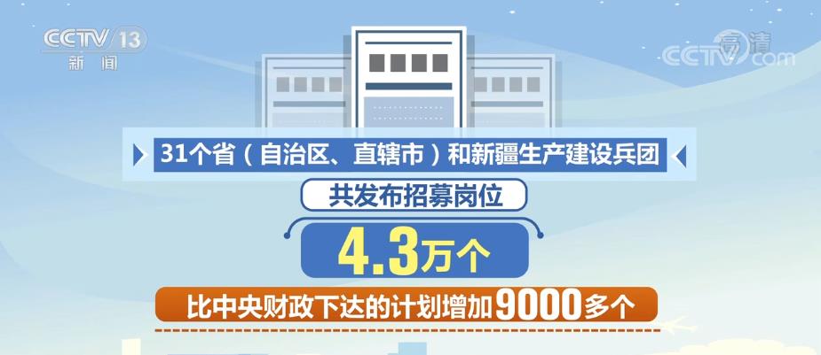 2022年高校畢業(yè)生“三支一扶”計劃招募工作已基本完成,31個。ㄗ灾螀^(qū)、直轄市)和新疆生產(chǎn)建設(shè)兵團共發(fā)布招募崗位4.3萬個,比中央財政下達的計劃增加9000多個。