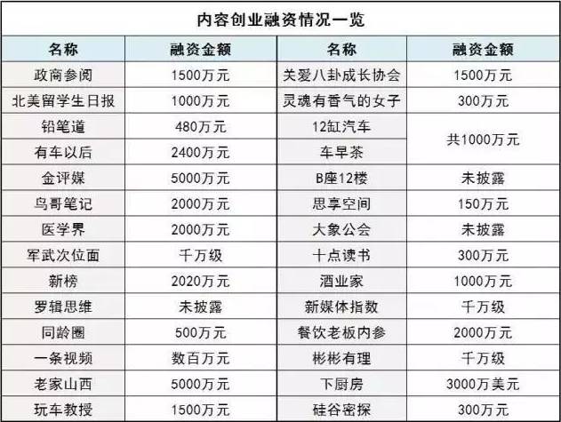 papi醬、羅輯思維、北美留學(xué)生日?qǐng)?bào)、大象公會(huì)等業(yè)內(nèi)有名的自媒體大號(hào),都紛紛獲得了資本的青睞。從下圖不完全統(tǒng)計(jì)的數(shù)據(jù)中能窺見(jiàn),內(nèi)容生產(chǎn)者正在前所未有的和資本進(jìn)行著緊密的連接。