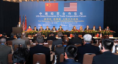 9月8日,正在美國(guó)進(jìn)行正式友好訪問(wèn)的中國(guó)全國(guó)人大常委會(huì)委員長(zhǎng)吳邦國(guó)在菲尼克斯出席中美經(jīng)貿(mào)合作論壇開(kāi)幕式并發(fā)表演講。新華社記者 馬占成 攝