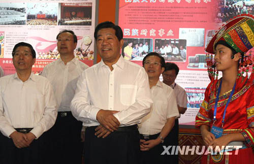 9月9日,中共中央政治局常委、全國政協(xié)主席賈慶林在北京民族文化宮參觀內(nèi)蒙古、新疆、廣西、寧夏、西藏自治區(qū)成就展。新華社記者姚大偉攝