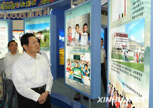 9月9日,中共中央政治局常委、中央政法委書記周永康在北京民族文化宮參觀內(nèi)蒙古、新疆、廣西、寧夏、西藏自治區(qū)成就展。新華社記者 丁林 攝