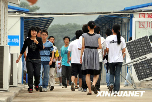 2008年7月3日,在綿陽長虹培訓(xùn)中心考點(diǎn),北川中學(xué)和來自北川的其他高考學(xué)生參加高考。新華社發(fā)