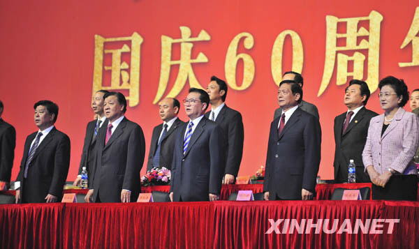 9月25日,“百團(tuán)萬(wàn)人頌中華”國(guó)慶60周年大型合唱歌詠會(huì)在北京“水立方”舉行。中共中央政治局常委李長(zhǎng)春出席觀看。這是李長(zhǎng)春等與全場(chǎng)群眾一起唱響《歌唱祖國(guó)》。新華社記者謝環(huán)馳攝