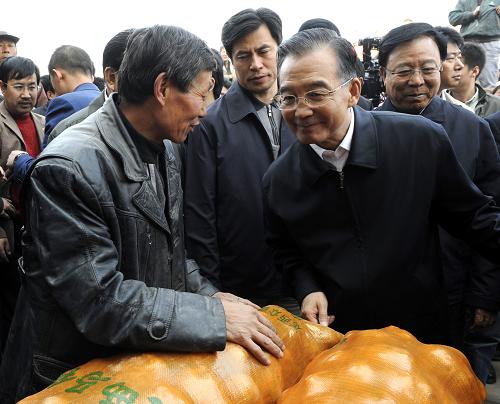 隨后,溫家寶來到村子里看望村民。在賈信家的院子里,總理親切招呼村民們坐下,與大家聊起家常。好客的主人端來一盤煮熟的土豆,請總理嘗一嘗。溫家寶拿起一個津津有味地吃了起來,夸獎說“味道不錯”。