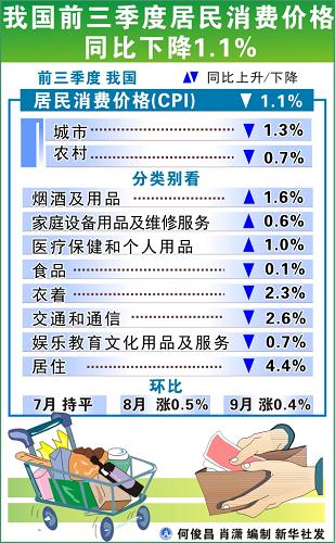 統(tǒng)計顯示,從同比情況看,前三季度我國CPI下降1.1%。從更能反映價格變動的環(huán)比情況看,CPI7月份由下降轉為持平,8、9月份分別上漲0.5%和0.4%。