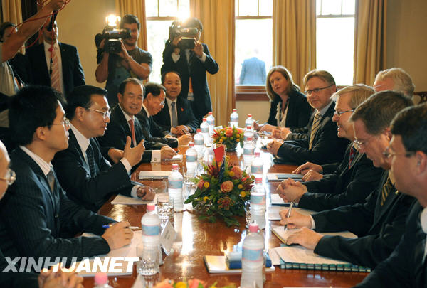 陸克文首先祝賀中華人民共和國成立60周年,對中國人民在60年中取得的成就表示欽佩。陸克文表示,目前澳中關(guān)系有兩個(gè)顯著的特點(diǎn),一是經(jīng)貿(mào)關(guān)系不斷擴(kuò)大,生機(jī)勃勃;二是雙方不僅在區(qū)域組織,而且在二十國集團(tuán)等國際機(jī)制中密切合作。我們應(yīng)在過去堅(jiān)實(shí)的基礎(chǔ)上,把兩國關(guān)系提升到新的高度。