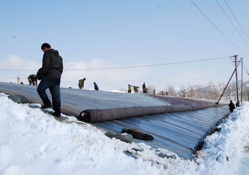 11月12日,群眾組織起來(lái)支起被暴雪壓倒的蔬菜大棚。