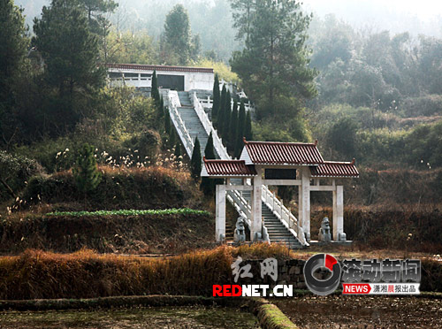 1月26日中午,瀟湘晨報滾動新聞記者驅(qū)車來到衡陽市衡南縣硫市鎮(zhèn)太陽村大樹組,隔著一片水田的鄉(xiāng)道對面,很容易就發(fā)現(xiàn)了網(wǎng)帖中的那個“豪華墓地”,如果在遠(yuǎn)處眺望,還會以為這是個建在半山腰上的祠堂,在這個規(guī)模跟烈士墓一般大的地方,進(jìn)門的牌坊頂上是“劉氏陵園”四個大字,和網(wǎng)上照片沒有任何區(qū)別。