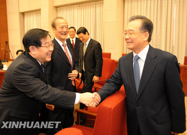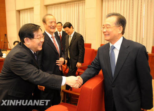 1月29日,溫家寶主持召開座談會(huì),聽取各民主黨派中央、全國工商聯(lián)負(fù)責(zé)人和無黨派人士代表對(duì)《政府工作報(bào)告》的意見。這是溫家寶與出席座談會(huì)的代表握手。1月22日至2月1日,國務(wù)院總理溫家寶在北京中南海主持召開五次座談會(huì),征求對(duì)即將提請(qǐng)十一屆全國人大三次會(huì)議審議的《政府工作報(bào)告》的意見。新華社記者 劉建生 攝
