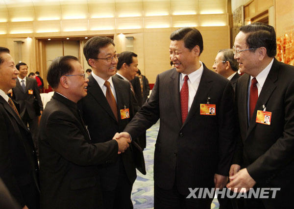 3月5日,中共中央政治局常委、國(guó)家副主席習(xí)近平來(lái)到他所在的十一屆全國(guó)人大三次會(huì)議上海代表團(tuán),同代表們一起審議政府工作報(bào)告。新華社記者劉建生攝