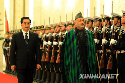 3月24日,中國國家主席胡錦濤在北京人民大會堂舉行儀式,歡迎阿富汗總統(tǒng)卡爾扎伊訪華。新華社記者樊如鈞攝