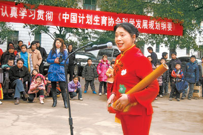祁東縣靈官鎮(zhèn)計生協(xié)會會員賀玉英在演唱由《中國計劃生育協(xié)會科學發(fā)展規(guī)劃綱要》改編而成的漁鼓調(diào)詞。何曉曉 攝