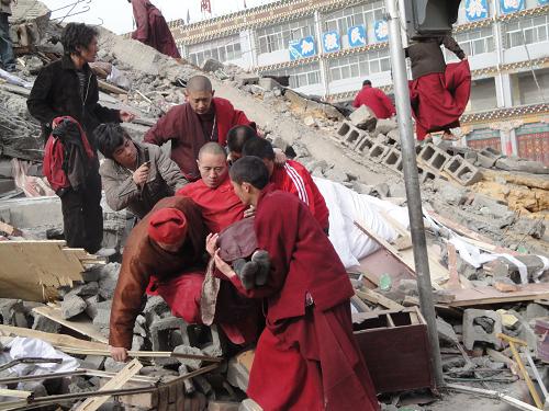 4月14日,玉樹縣結古鎮(zhèn)群眾在地震發(fā)生后的第一時間從廢墟中搶救出傷員。新華社發(fā)(張紅栓 攝)
