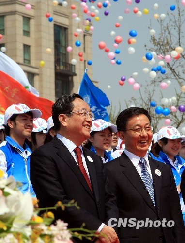4月17日,上海世博會志愿者宣誓上崗儀式在外灘舉行,面對精神抖擻的志愿者代表,中共中央政治局委員、上海市委書記俞正聲(左)、上海市長韓正在儀式上笑逐顏開。 中新社發(fā) 潘索菲 攝