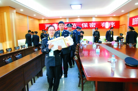 監(jiān)考人員領(lǐng)取考試試卷。