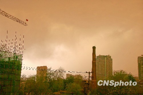 4月26日13時40分左右,石家莊市區(qū)突然暗云壓境,西部天空完全被昏黃暗紅的云層籠罩,市區(qū)能見度霎時降低,有如黑夜即將降臨。至15時20分,天空重又艷陽高照。河北省氣象臺高級工程師郭迎春表示,這是受冷空氣影響所致,否認(rèn)與市民擔(dān)心的地震或火山灰有關(guān)。據(jù)透露,當(dāng)日下午,河北保定、石家莊、衡水、邢臺、邯鄲、張家口等地64縣市出現(xiàn)7到8級大風(fēng),陣風(fēng)9級。中新社發(fā) 李光 攝