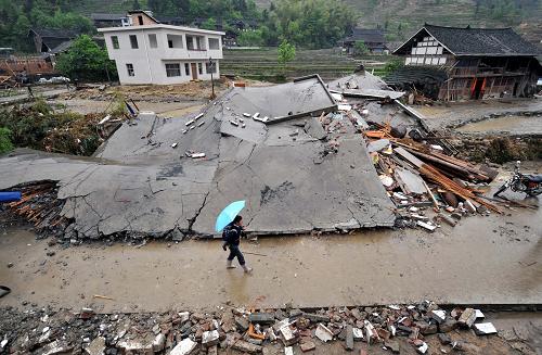 5月7日,在新化縣奉家鎮(zhèn),一村民走過(guò)被洪水沖毀的房屋。5月6日凌晨至7日上午,湖南省氣象臺(tái)連續(xù)發(fā)出11個(gè)暴雨橙色預(yù)警信號(hào),6個(gè)暴雨紅色預(yù)警信號(hào)。目前,湖南省有300余個(gè)鄉(xiāng)鎮(zhèn)遭遇強(qiáng)降雨。災(zāi)情最嚴(yán)重的新化縣,已有5人死亡2人失蹤,38萬(wàn)余人受災(zāi)。當(dāng)?shù)囟鄶?shù)學(xué)校已暫時(shí)停課,5300名學(xué)生回家避險(xiǎn)。新華社記者 趙眾志 攝
