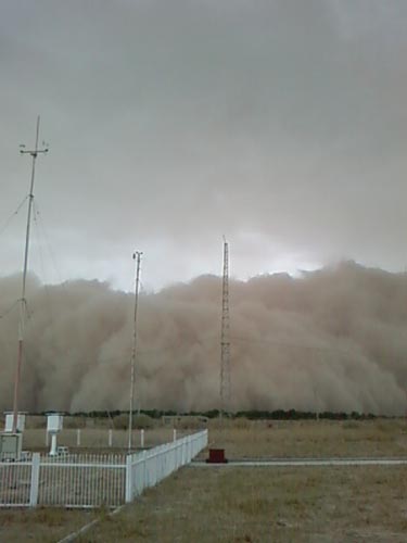 受高空槽影響,5月14日19時(shí)54分,一股強(qiáng)沙塵暴如同滾滾黑煙自西南方向向東北方向襲擊了青海省格爾木地區(qū)。最小能見(jiàn)度為200米,最大風(fēng)速達(dá)每秒22.3米,白晝立即變成“黑夜”。