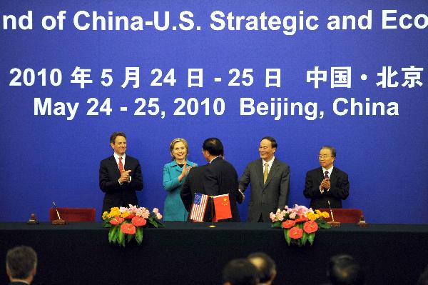 5月25日,中美雙方在北京簽署七項合作協(xié)議,涉及能源、貿(mào)易、融資、核能利用等多個方面。中國國家主席胡錦濤特別代表國務院副總理王岐山和國務委員戴秉國,美國總統(tǒng)奧巴馬特別代表、國務卿希拉里·克林頓和財政部長蒂莫西·蓋特納等參加第二輪中美戰(zhàn)略與經(jīng)濟對話的兩國高官出席了簽字儀式。新華社記者張鐸攝