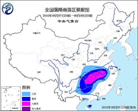 預計,6月7日20時到6月8日20時,陜西東南部、河南南部、湖北、安徽中南部、江西北部、湖南大部、貴州大部、重慶大部、廣西北部和南部、海南中北部等地有大到暴雨,其中,貴州東北部、湖南北部、江西西北部、湖北南部、安徽西南部等地的部分地區(qū)有大暴雨。
