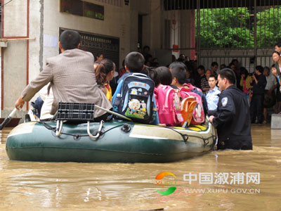從洪水進入校園的那一刻起,副縣長陳正平帶領導電力、林業(yè)、公安、城市管理執(zhí)法、交警、人武部400多名黨員干部在考點外守候,考試一結束,干部、干警們就甘當人梯,將學生一個一個的背出考點,縣人武部還組織4個應急小分隊,用救生艇轉移將困在樓上的學生,將楚才中學考點的756名考生全部安全轉移。