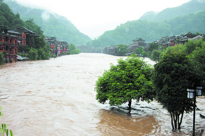 8日上午,洶涌的沱江洪水淹沒了鳳凰古城的江邊游道和著名景點(diǎn)跳巖,一些街道由于排水不暢或因洪水涌入變?yōu)闈蓢。位于鳳凰古城西門外的新市場街道積水漫過腰部,沈從文故居旁的南門坨街道已進(jìn)水,鳳凰古城最出名的鎮(zhèn)竿張氏姜湯倉庫也遭水浸,不少居民都無法出門。