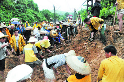 200多名干部群眾正在滬昆鐵路1464+475m段塌方現(xiàn)場奮力搶修。石之光攝(圖片來源:長沙晚報)