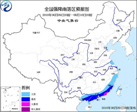 預(yù)計,6月9日20時到6月10日20時,江蘇東部、浙江南部、福建大部、廣東大部、廣西中南部、臺灣西北部等地有大雨,其中,福建南部、廣東中南部、廣西東南部等地有暴雨,局部有大暴雨;上述部分地區(qū)還將伴有短時雷雨大風(fēng)等強對流天氣。
