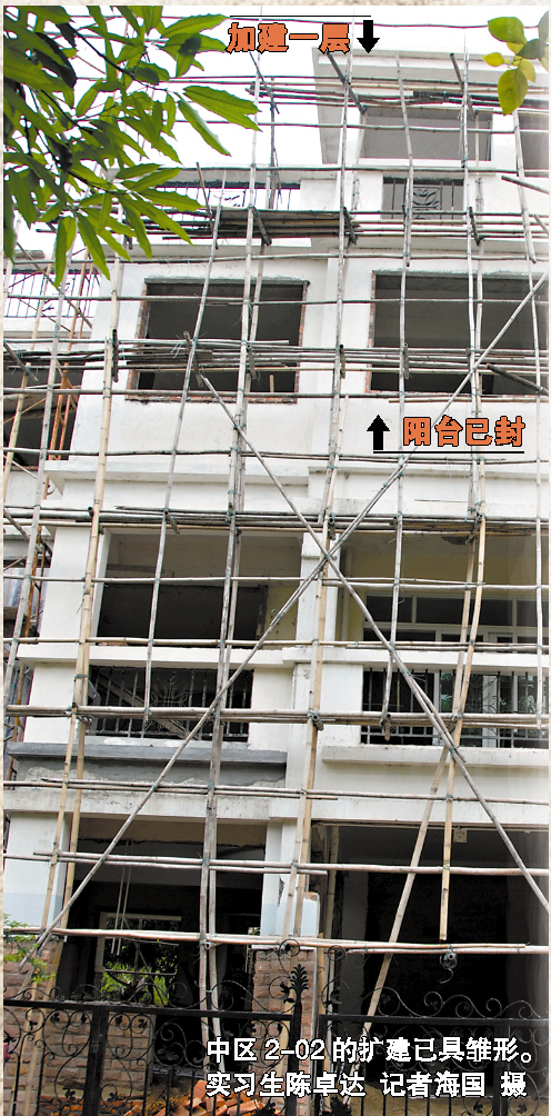 昨日(12日)上午,記者來到南浦海濱花園探營,發(fā)現(xiàn)3幢別墅的外墻正搭著腳手架。從施工情況來看,中區(qū)2-02別墅擴(kuò)建的別墅已現(xiàn)雛形,不僅比周圍的別墅高出一層,外面還凸建出一段。記者走進(jìn)去一看,原來2層的天臺(tái)已向外凸建并被封閉成房間,小陽臺(tái)也被封閉起來,多建的樓梯通向3層天臺(tái)!案慕ê螅嗔50多平方米”,現(xiàn)場的施工人員說,改建工期大約要4個(gè)月,記者看到墻上還張貼著物管公司的裝修許可證。
