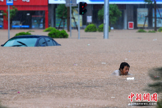 6月9日,廣西重點防洪城市梧州遭遇了四年來最嚴重的一次內(nèi)澇,導(dǎo)致梧州新興二路兩廣市場加油站附近路段交通全部癱瘓。在兩廣市場附近,多輛汽車被困于水中。圖為一被困市民游水逃生。 中新社發(fā) 何鎏 攝