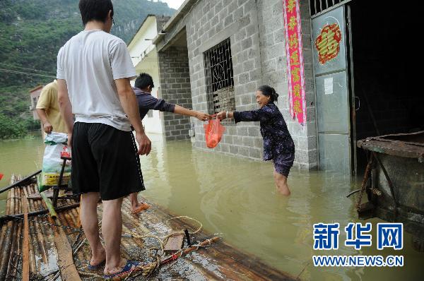 6月15日,在廣西東蘭縣三石鎮(zhèn)公平村拉平屯,救援人員給受災(zāi)群眾送食物。 6月13日和15日凌晨,廣西東蘭縣再遭強(qiáng)降雨襲擊,導(dǎo)致三石鎮(zhèn)公平村拉平屯內(nèi)澇嚴(yán)重,120余人被困。災(zāi)情發(fā)生后,當(dāng)?shù)亓⒓唇M織海事、消防、防汛等部門投入救災(zāi)。目前尚未有人員傷亡報(bào)告。新華社發(fā)(韋禮富 攝)