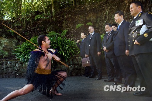 國(guó)家副主席習(xí)近平于當(dāng)?shù)貢r(shí)間6月17日抵達(dá)奧克蘭,開始對(duì)新西蘭進(jìn)行正式訪問(wèn)。圖為在奧克蘭總督府,新西蘭方以毛利人傳統(tǒng)儀式迎接習(xí)近平一行。 中新社發(fā) 胡旭君 攝
