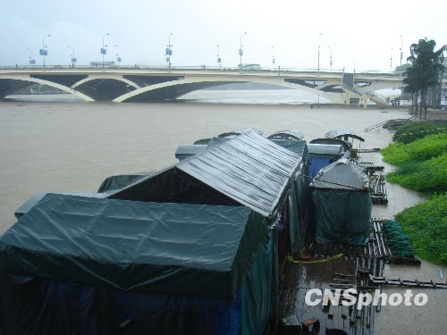 6月17日8時20分,桂林市氣象局發(fā)布暴雨紅色預(yù)警信號:桂林市區(qū)預(yù)計(jì)3小時雨量將達(dá)100毫米以上,且降雨可能持續(xù)。10時39分,桂林市區(qū)段漓江水位達(dá)到146米,超過警戒水位0.3米,預(yù)計(jì)下午16時,漓江水位將達(dá)到147.2米。圖為停靠在桂林市解放橋下的魚船。 中新社發(fā) 歐惠蘭 攝