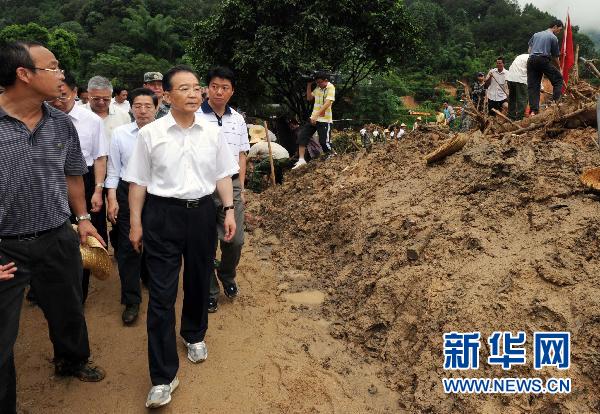 6月19日至20日,中共中央政治局常委、國務(wù)院總理溫家寶來到廣西梧州市,實地察看汛情、災(zāi)情,慰問奮戰(zhàn)在抗洪救災(zāi)一線的干部群眾,主持召開會議,部署防汛抗洪救災(zāi)工作。這是6月20日,溫家寶總理冒雨來到大山深處的蒼梧縣沙頭鎮(zhèn)雙尚村杉木坪自然村,察看因山體滑坡、泥石流造成的災(zāi)情。新華社記者李濤攝