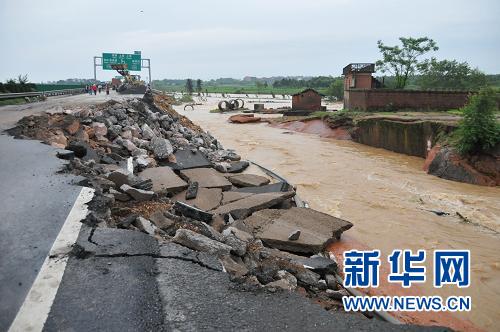 滬昆高速垮塌現(xiàn)場(6月21日攝)。6月20日上午8時(shí)至12時(shí),因?yàn)檫B續(xù)多日強(qiáng)降雨導(dǎo)致白塔河決堤,洪水導(dǎo)致滬昆高速江西余江段4處垮塌,最大的垮塌處達(dá)50多米。目前,當(dāng)?shù)匾呀?jīng)組織1000多名工人,200多臺(tái)車輛進(jìn)行搶修,力爭21日天黑前實(shí)現(xiàn)通車。新華社記者 周密攝