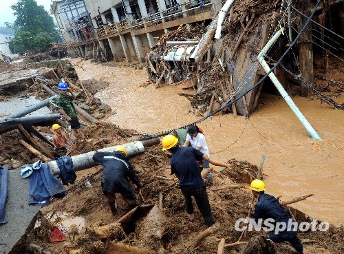 6月22日下午,福建南平市供排水部門的工作人員在該市延平區(qū)安豐路被洪水沖垮的路段搶修自來水供應(yīng)管道。自6月13日以來,福建連續(xù)遭受特大暴雨襲擊,造成了歷史罕見的自然災(zāi)害,截至21日16時初步統(tǒng)計因災(zāi)死亡76人、失蹤79人,直接經(jīng)濟(jì)總損失95.51億元人民幣。 中新社發(fā) 劉可耕 攝