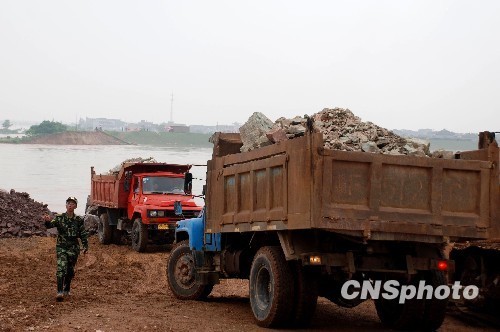 當(dāng)?shù)匾阎辽俳M織了一百輛大卡車(chē)投入運(yùn)輸石料,全市所有石料廠不間斷作業(yè),全力支持決堤口封堵工程。 中新社發(fā) 劉占昆 攝