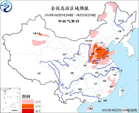 中央氣象臺29日06時繼續(xù)發(fā)布高溫藍(lán)色預(yù)警:預(yù)計(jì),今天白天,內(nèi)蒙古東北部和中部的部分地區(qū)、黑龍江西北部、山西大部、河北大部、天津、河南大部、山東大部、安徽北部、江蘇西北部、福建北部和南部的部分地區(qū)、江西東北部的部分地區(qū)、海南北部等地有35~37℃、部分地區(qū)38℃的高溫天氣,其中,河北南部的局部地區(qū)氣溫可達(dá)40℃。